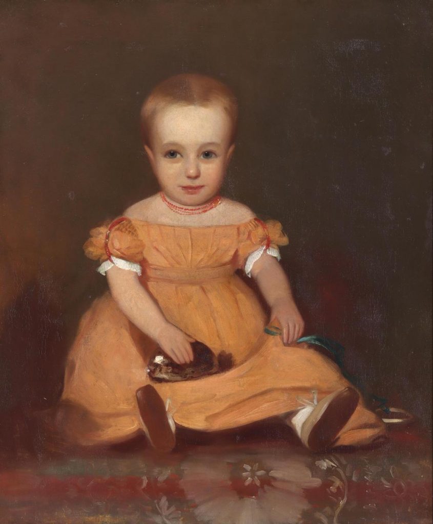 Oil on canvas, 20″ x 25 inches $1,950 Charming full length portrait of young girl with a great smile wearing
