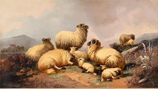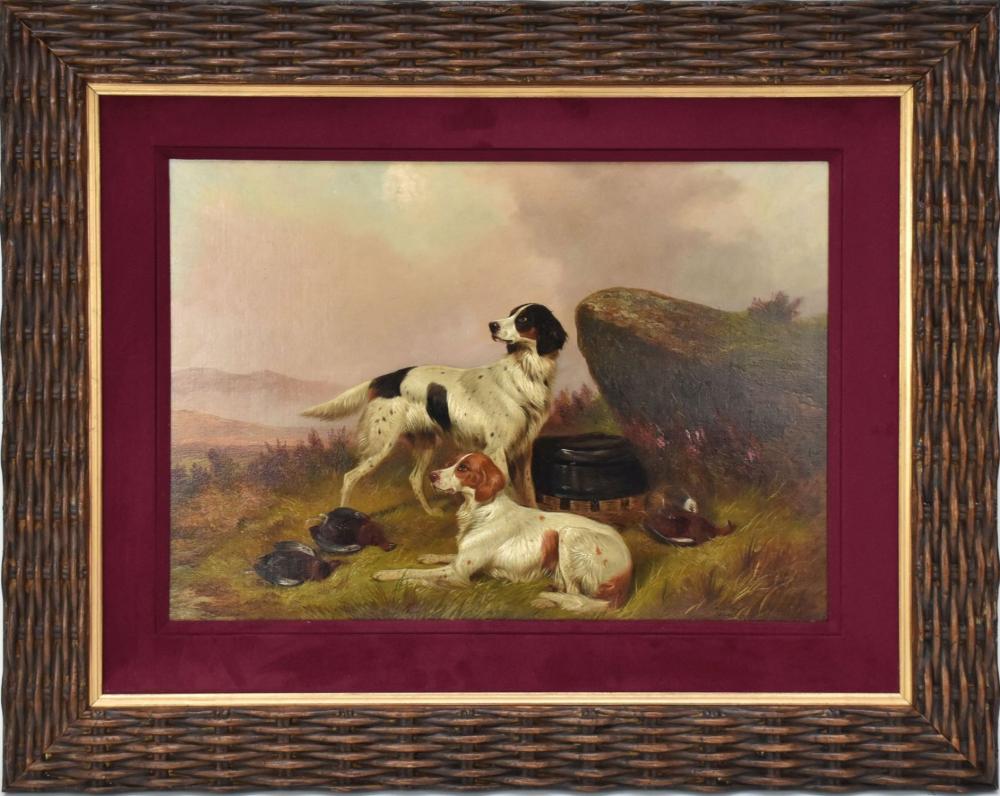 Oil on canvas, 16″ x 32″ signed and dated (?1900) $1,850 This classic portrayal of two setters retrieving grouse on